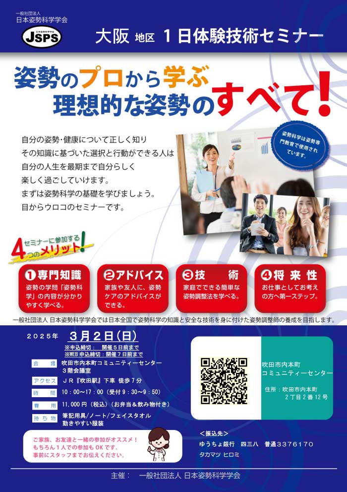 姿勢のゆがみや腰痛、膝痛、肩こり⋯などを医学的見地から究明し、健康長寿を目指す患者さんから喜ばれ感謝されるお仕事です。人体を構成する骨格系と筋肉のバランスを回復し、神経の働きを正常に整える「姿勢医学園」の分野にもとづく技術で、肩こり、腰痛、膝痛等の原因となる"姿勢バランス"調整を行う最新の根本治療です。姿勢療法はバキボキするものではなく安全・安心の手技です。また、施術のみではなく、各検査により必要な栄養補助食品のアドバイス、 病院への紹介など健康に関する様々なお手伝いもいたします。
